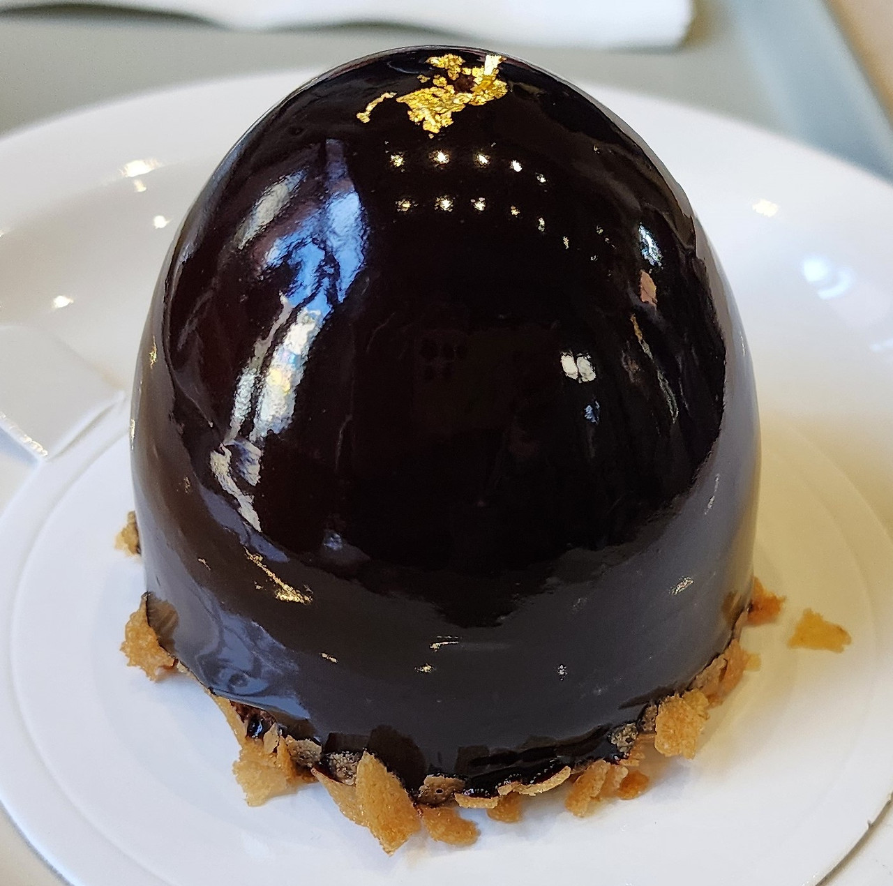 - 수플레의 쇼콜라 무스는 다크 초콜릿이 풍부하게 사용된 디저트로, 매끈한 표면과 세련된 데코레이션이 특징입니다.